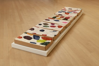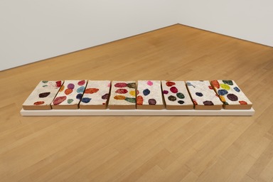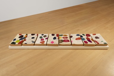 The Dwarves without Snow White is Polly Apfelbaum’s first velvet piece, made the same year she began directly pouring paint onto her works. The artist considers velvet “the perfect modern material” for its simultaneous elegance and accessibility, folding it atop garment boxes fashioned into pedestals, a down-to-earth translation of fine-art presentation modes. Since the 1970s, women artists have often engaged horizontal forms for their artworks, a deliberate departure from traditional—vertical, phallic—conventions of monumental art.