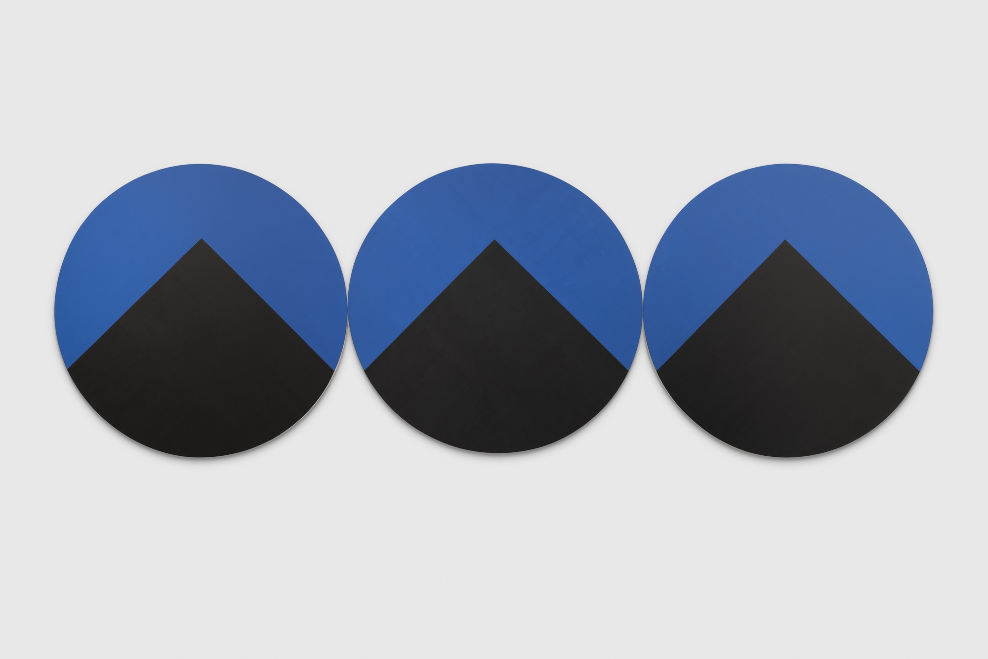 Leon Polk Smith (American, 1906–1996). Midnight Pyramids (Midnight Teepees), 1986. Acrylic on canvas, 3 parts, each 80 in. diameter; overall: 80 × 240 in. (203.2 × 609.6 cm). Brooklyn Museum, Bequest of Leon Polk Smith, 2011.12.9a-c. © artist or artist's estate (Photo: Brooklyn Museum, 2011.12.9a-c_PS22.jpg)
