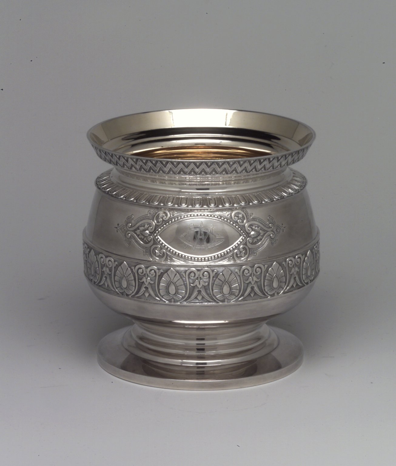 Slop or waste bowl; silver, cast and repoussé decoration; part of a six-piece tea and coffee service (75.164.1-.6). Circular stepped base, inset squat stem, circular body narrowing toward top, inset neck broadening flange collar around top. Repoussé decoration consists of band of stylized acanthus around body; almond-shaped lozenge with stylized acanthus border enclosing seated Cupid figure blowing horn. Same lozenge on reverse enclosing engraved monogram, "MAC". Raised or cast molding around base of neck and top flange. Interior appears gold-washed (?).