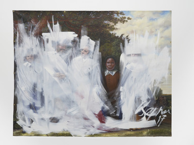 This work came together in two stages. After painting a copy of Frans Hal's Family Group in a Landscape (ca 1645–58), Titus Kaphar unveiled the work during his 2017 TEDTalk and began applying loose, white brushstrokes over the figures. He stopped at the final subject, a young Black boy thought to be the family's servant, whom Kaphar left visible. Across his wide-ranging practice, Kaphar seeks to shift the viewer's gaze, reorienting audiences to focus on historically overlooked subjects.