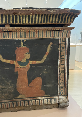 Outer Coffin of Kamwese, ca. 1390–1352 B.C.E. Wood, pigment, 41 3/4 x 35 7/16 x 95 1/4 in. (106 x 90 x 242 cm). Brooklyn Museum, Charles Edwin Wilbour Fund, 37.15E. Creative Commons-BY (Photo: Brooklyn Museum, CUR.37.15E_detail28.JPG)
