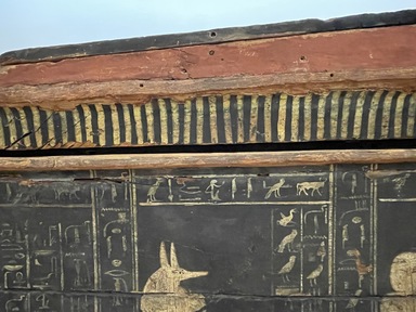 Outer Coffin of Kamwese, ca. 1390–1352 B.C.E. Wood, pigment, 41 3/4 x 35 7/16 x 95 1/4 in. (106 x 90 x 242 cm). Brooklyn Museum, Charles Edwin Wilbour Fund, 37.15E. Creative Commons-BY (Photo: Brooklyn Museum, CUR.37.15E_detail16.JPG)