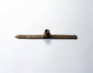 Most Ainu religious rituals focus on the transfer of prayers and offerings from the human world to the spirit world. Carved prayer sticks, called ikupasuy, serve as translators and messengers between the worlds. They are held during prayers in most Ainu ceremonies; in rituals that involve rice wine, the stick is dipped in the wine so that droplets can be dedicated to the spirits. One of the prayer sticks shown here has a miniature wine cup carved on top. Ikupasuy are the only Ainu art form to include representations of animals, as seen in the fish and bear’s head on another example shown here.