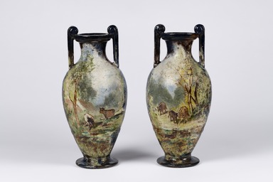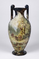 One of pair (with 44.31.3) of red earthenware vases decorated with underglaze slip painting. Slip was made of ground porcelain acquired from the Union Porcelain Co. Vase has a pastoral view of cows and trees on one side; the other side mottled in blue and brown, two vertical handles.